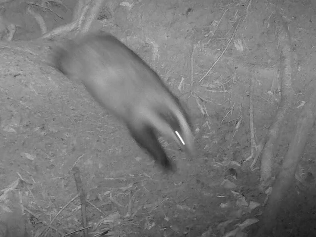 J’ai entendu une sorte de sifflement rauque et bref, comme un raclement de gorge ou un chat effrayé qui crache devant une menace, et j’ai vu, face à moi, le blaireau stupéfait et qui, pris d’une panique pire que celle qui m’avait saisi dans la clairière près de la route, a immédiatement fait demi-tour et s’est enfui. Pensez donc : en ce lieu où il se sentait en sécurité et vaquait sans précaution à la recherche de nourriture, voici que surgit une voiture – disons, l’équivalent d’un phare de voiture, car cette frontale est puissante… Je l’ai vu détaler de toutes ses forces, soit un sprint qu’on peut estimer à trente kilomètres heure, et la caméra de la gueule 3 à cent mètres de là a capté ensuite son passage précipité car il ne s’est même pas arrêté au terrier où il aurait pu trouver refuge… Ah, oui, je voudrais que tous ceux qui disent du blaireau que c’est un lourdaud le voient courir ainsi !