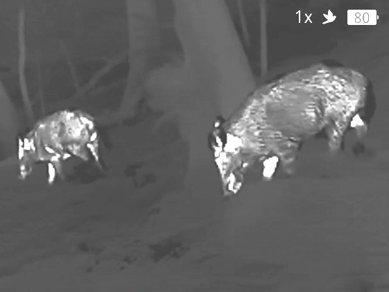 Le temps de rallumer, les sangliers sont là, à quelques mètres à peine. Comme nous sommes face au vent (tiède et mou) et qu’ils sont occupés à fouiller le sol de leurs gros groins en avançant au pas comme le font les blaireaux, ils ne perçoivent pas notre présence, pourtant si proche. Cela fait de drôles de sangliers avec un trou blanc au niveau du front, les pattes et l’arrière-train mouchetés d’étincelles, la queue et les sabots très noirs – animaux fantastiques ! C’est le monde sensoriel à l’envers : la technologie nous permet, à nous autres humains, de percevoir ce qu’eux-mêmes ne perçoivent pas, d’être près d’eux, en leur présence, sans qu’ils s’en doutent – on tremble en songeant que ce terrible outil est acheté d’abord par les chasseurs…