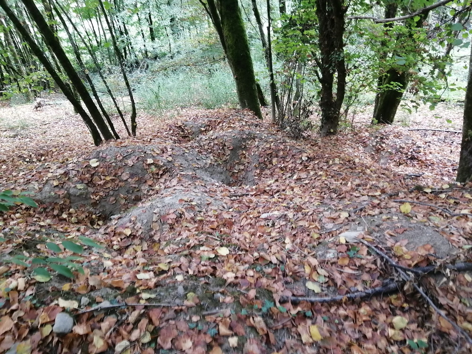 Vu d’en bas, c’est encore plus impressionnant. Mon terrier du Villard fait pâle figure, à côté de celui-ci. Ce qui frappe avant tout, c’est l’ampleur des terrassements opérés dans ce sol argileux, très meuble, mais rendu très dur, lisse et glissant par la sècheresse. On compte dans un même espace, sur plusieurs niveaux, cinq cônes de déblais autour de vastes gueules bien dégagées qui sont donc certainement occupées, même si je ne vois pas de latrines. J’ai repéré deux terriers périphériques près de la lisière, en montant, et il y en a probablement bien d’autres sur cette pente raide quadrillée de pistes.