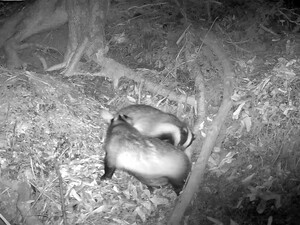 22h16, Vara est installée au milieu du toboggan, bien dans le champ, ce qui permet d’admirer sa bonne santé et son pelage décidément sans accroc (contrairement à celui de Cheg à l’automne dernier, que je reconnaissais sans peine grâce à ses blessures). Son ventre distendu me confirme qu’il s’agit bien d’une femelle qui a eu des petits. Elle est occupée à se gratter nonchalamment lorsqu’apparaît, à 22h16’59’’ exactement, la tête couverte de terre d’un deuxième blaireau – qui est, cette fois, un de ses blaireautins ! Tous deux aussitôt se rejoignent, se font la bise et s’épouillent sur le perron du terrier en une de ces scènes de tendresse que je n’avais plus revues depuis longtemps. Vara redescend, Courage ou Prudence la rejoint, l’épouillage mutuel reprend qui montre à quel point Meles meles, décidément, n’est pas un animal solitaire.