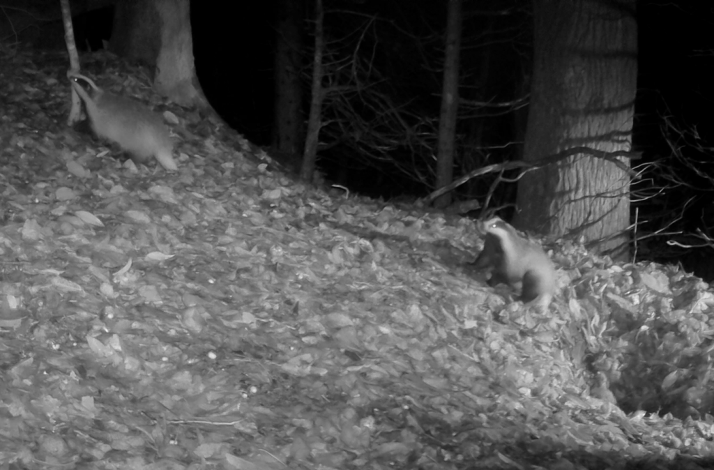 La nuit suivante commence inhabituellement tôt, avec un museau qui émerge à 17h44 mais ne s’attarde pas – le déclenchement suivant se produit à 20h37, soit un schéma proche de celui de la veille. Vara fait sa toilette, scrute la nuit, truffe tendue… Sur la seule vidéo capturée par la caméra de l’esplanade, on la voit s’en aller lentement, à 21h09, en quête de nourriture. Le retour à la gueule 3 se fait à 23h33, et voici cette fois deux blaireaux qui se retrouvent en se mordant, en s’épouillant : Courage et Prudence ! Un quart d’heure après, Vara seule les remplace, le trio apparaît séparé mais ses membres manifestement ne s’éloignent jamais tellement… Clap de fin de la nuit.
