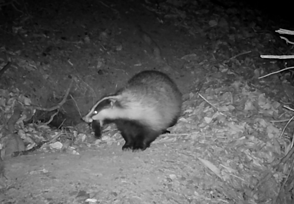 Ce n’est que la deuxième fois que j’observe un apport de nourriture au terrier, la fois précédente concernant Prudence qui avait dégusté des châtaignes devant l’entrée. Courage, quand il a trouvé cette taupe morte, a eu le réflexe d’y revenir, sans doute parce que c’est le lieu où il se sent le plus en sécurité et que c’était pour lui une trouvaille remarquable et peut-être inédite, surtout sous cette forme congelée ! On dit que les blaireaux ne mangent pas au terrier, je dirais pour ma part, à l’instar de Yann Lebecel, qu’il ne faut pas oublier le mot « généralement », ce qui laisse la place au moins à quelques repas ponctuels – qu’ils effectuent proprement, c’est vrai, car l’inspection rapide des lieux que j’ai pu faire après coup ne m’a permis de retrouver de traces ni des châtaignes, ni de la taupe (qui a pu être consommée ailleurs, après décongélation…). Ces images confirment cependant qu’il n’y a pas de partage de nourriture : Courage aura gardé pour lui seul ce trésor.